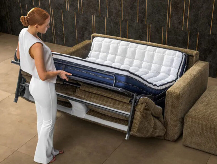 Divano letto trasformabile con innovativo meccanismo a ribalta ad apertura rapida elettrico, completo di materasso H17 cm in poliuretano espanso indeformabile a portanza equilibrata.