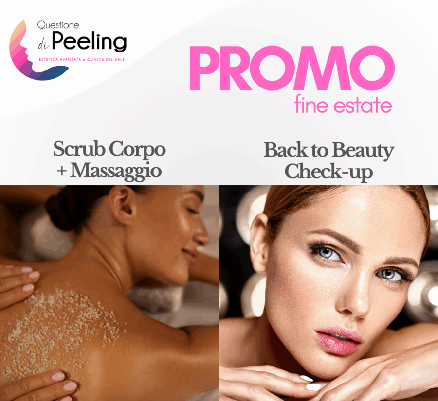 Approfitta di questa nostra promo di fine estate,  prenota il Check-Up Gratuito della tua pelle e scopri cosa davvero le serve! Avrai il 20% di Sconto sui prodotti consigliati e ben il 40% su un programma viso pensato su misura per te. E per chi desidera una pelle più luminosa e levigata, a soli 30€, potrà effettuare lo ScrubCorpo + Massaggio.